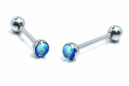 ボディピアスバーベルの片側のボールに、鮮やかなブルーに黄色でト音記号を描いたポップなバーベルです。