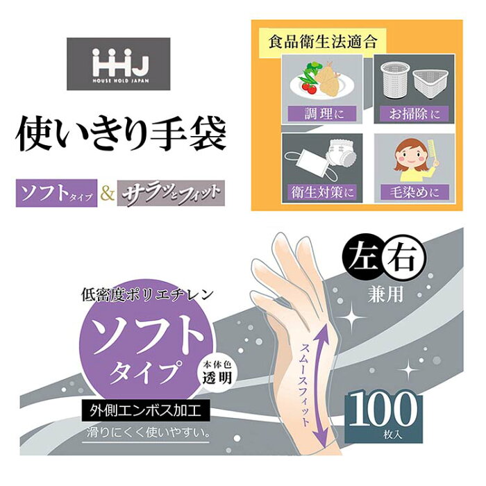 ハウスホールドジャパン 使いきり手袋 ソフトタイプ スムースフィット 透明 M 100枚入 HG02 【お取り寄せ可能】