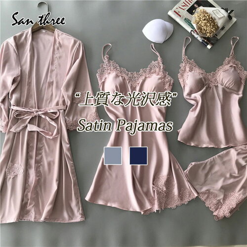 ランジェリー ルームウェア 4点セット レディース サテン パジャマ パッド入り トップス キャミソール ショートパンツ パンツ ワンピース ロングガウン セット レース 刺繍 セクシー ナイトウェア 可愛い 部屋着 高級感 Santhree